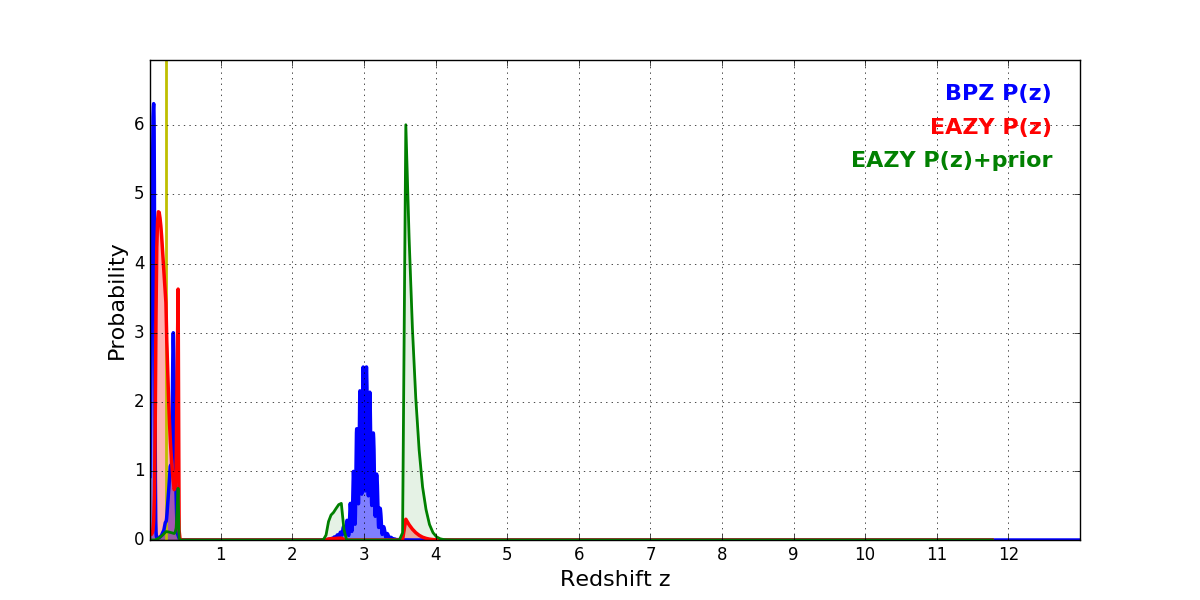 In P(z) plots: Yellow lines mark the cluster redshift z = 0.228,