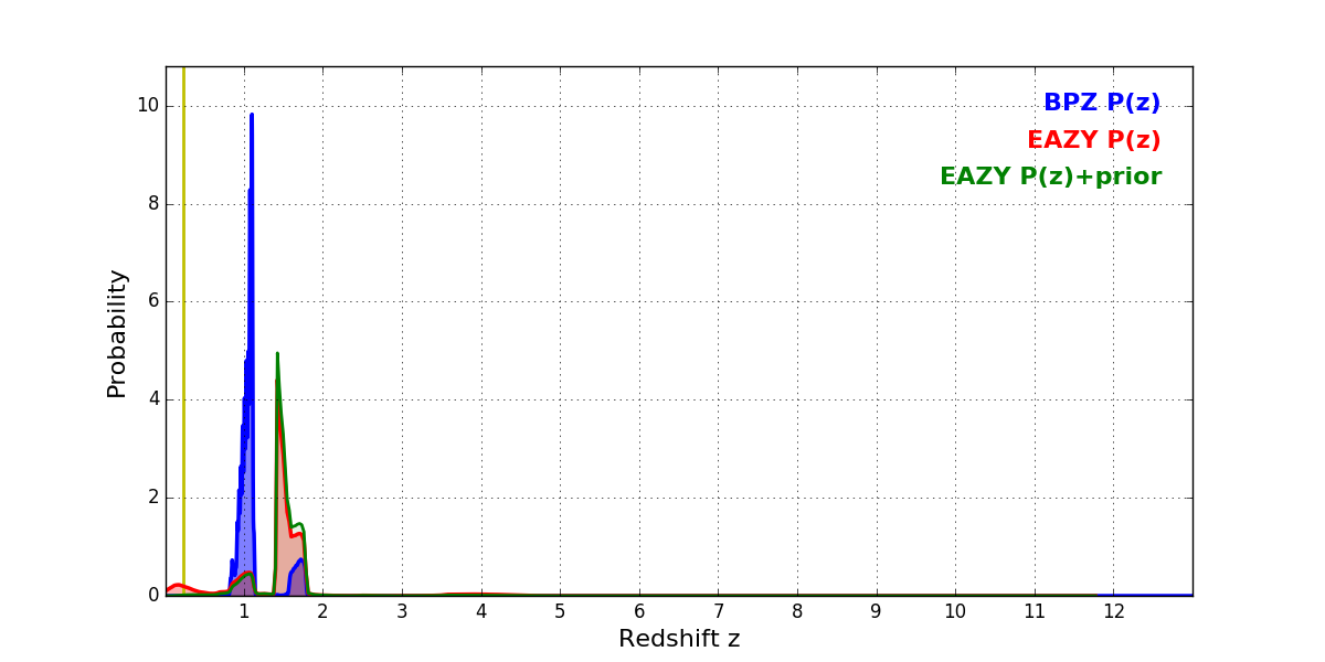 In P(z) plots: Yellow lines mark the cluster redshift z = 0.228,