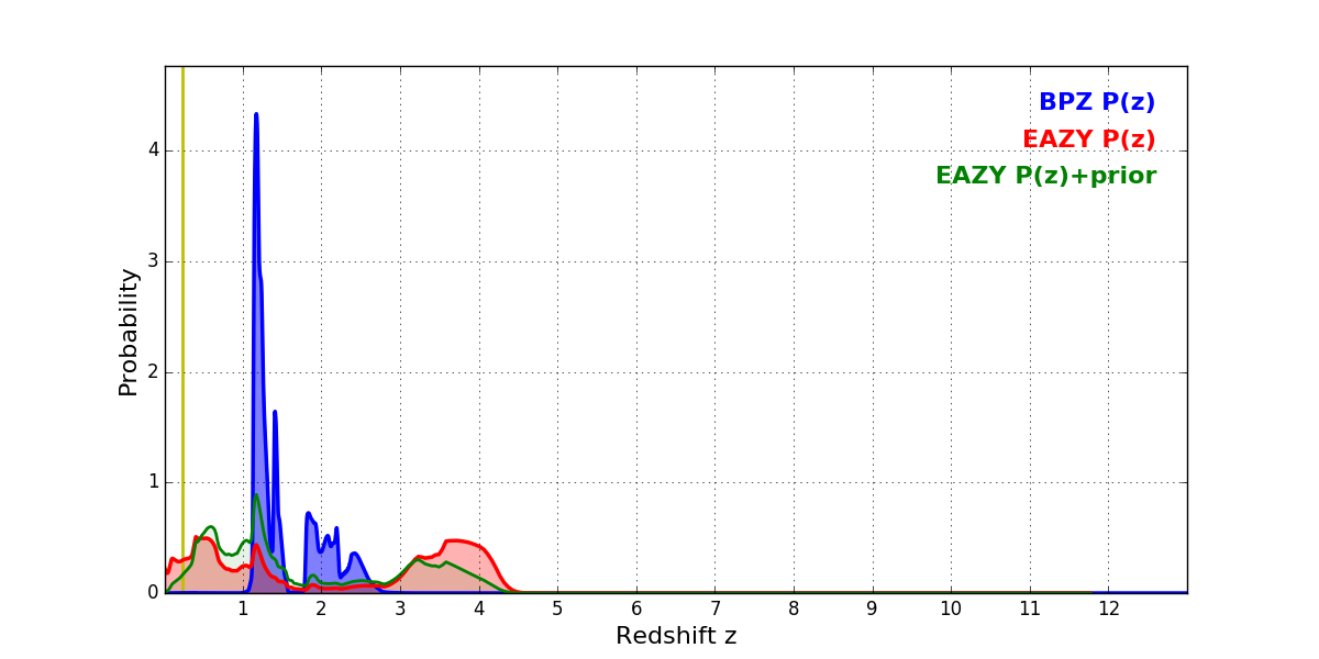 In P(z) plots: Yellow lines mark the cluster redshift z = 0.228,