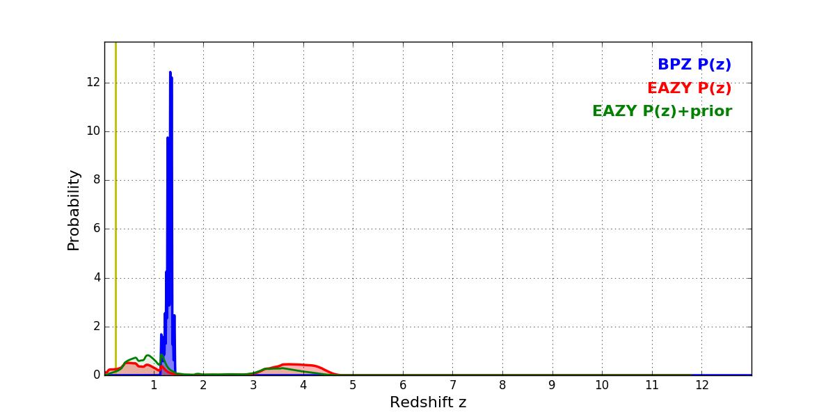 In P(z) plots: Yellow lines mark the cluster redshift z = 0.228,