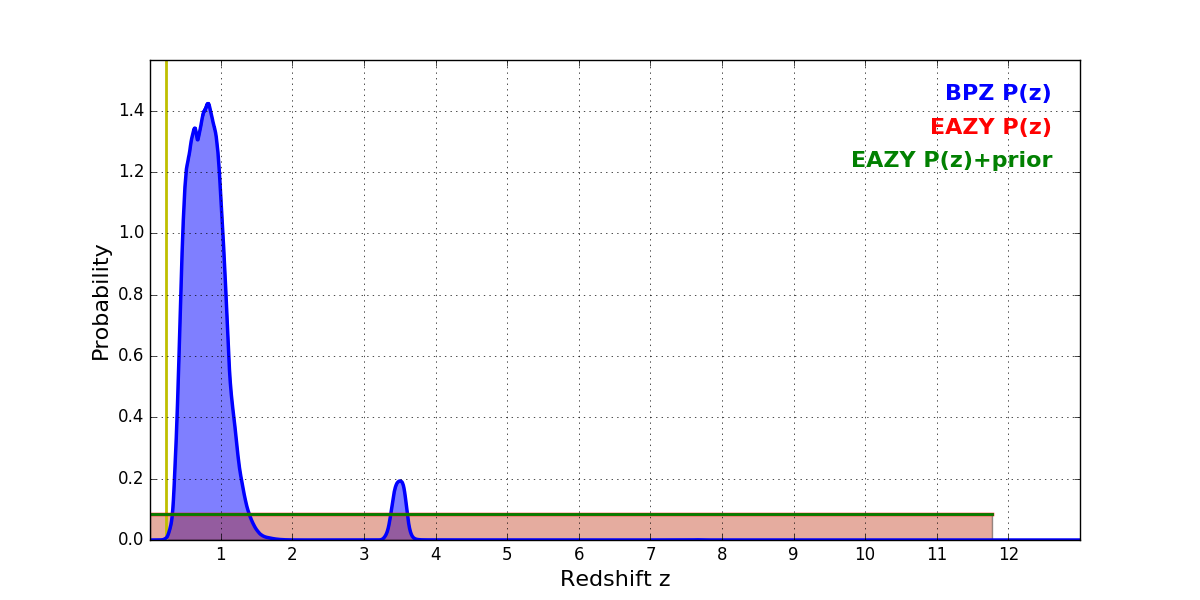 In P(z) plots: Yellow lines mark the cluster redshift z = 0.228,