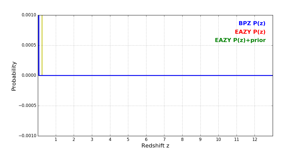 In P(z) plots: Yellow lines mark the cluster redshift z = 0.228,