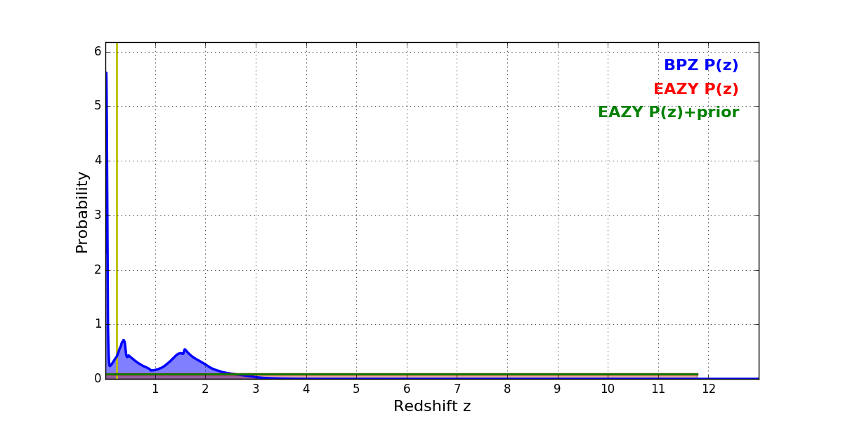 In P(z) plots: Yellow lines mark the cluster redshift z = 0.228,