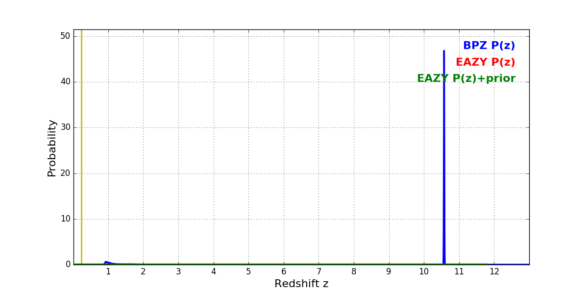 In P(z) plots: Yellow lines mark the cluster redshift z = 0.228,