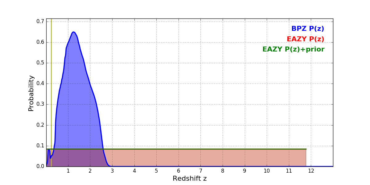 In P(z) plots: Yellow lines mark the cluster redshift z = 0.228,