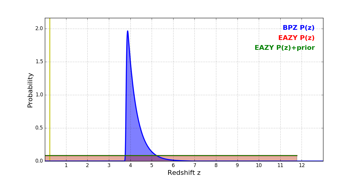 In P(z) plots: Yellow lines mark the cluster redshift z = 0.228,