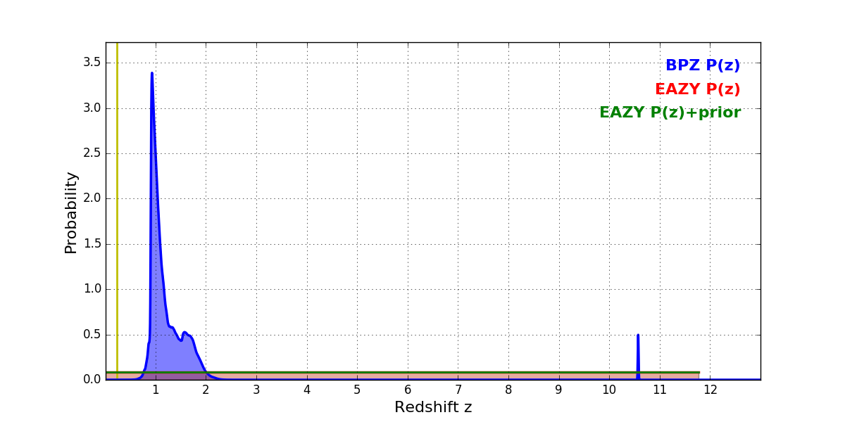 In P(z) plots: Yellow lines mark the cluster redshift z = 0.228,
