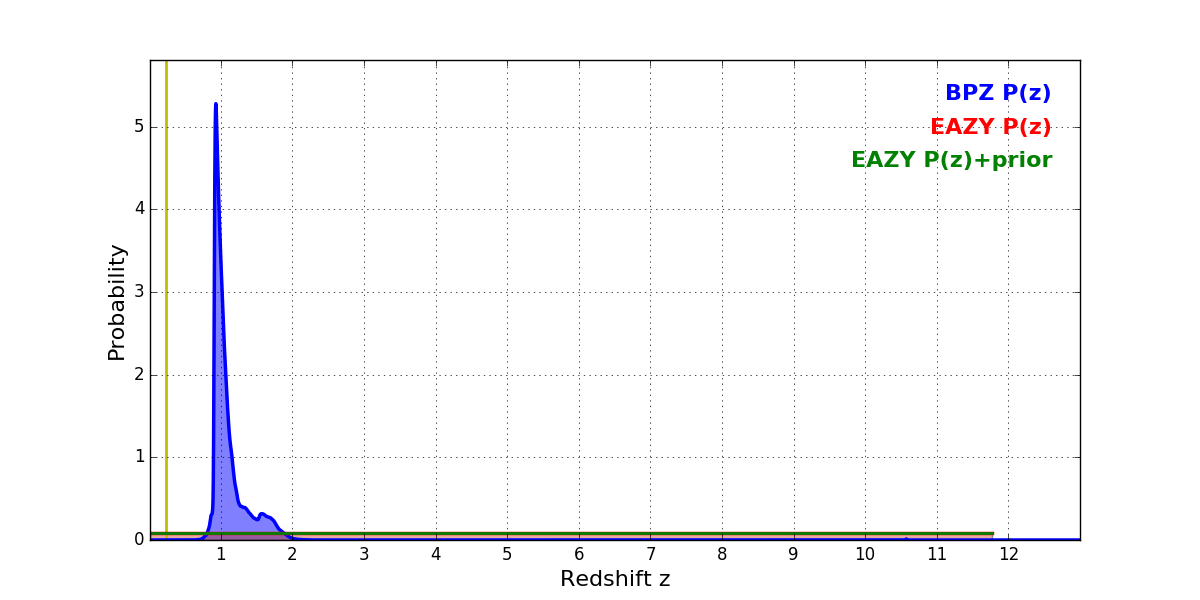 In P(z) plots: Yellow lines mark the cluster redshift z = 0.228,
