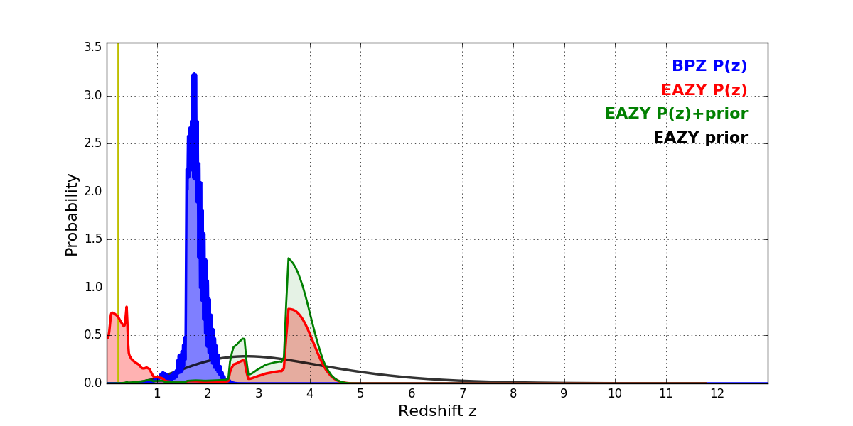 In P(z) plots: Yellow lines mark the cluster redshift z = 0.228,