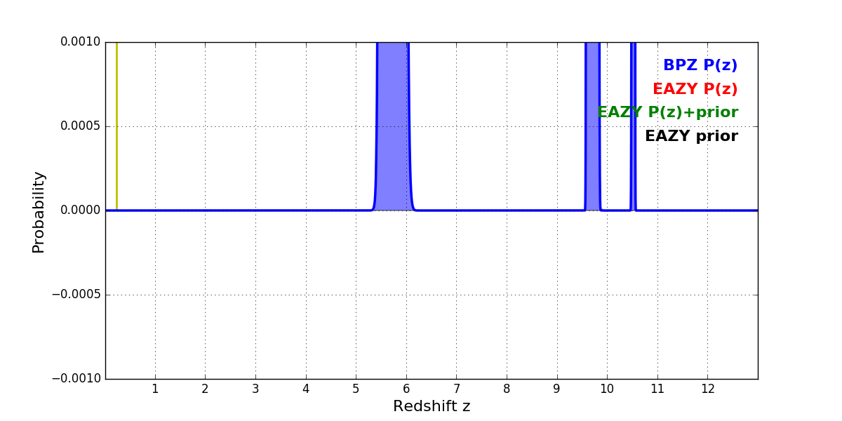 In P(z) plots: Yellow lines mark the cluster redshift z = 0.228,