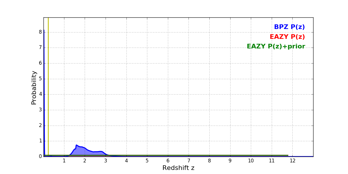 In P(z) plots: Yellow lines mark the cluster redshift z = 0.228,