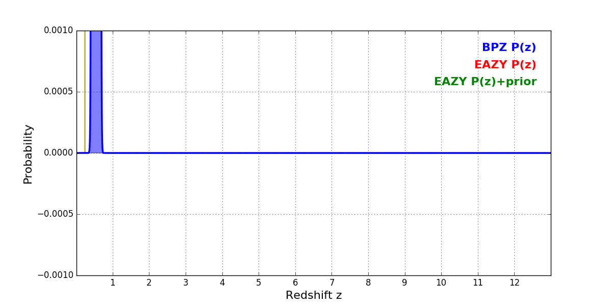 In P(z) plots: Yellow lines mark the cluster redshift z = 0.228,