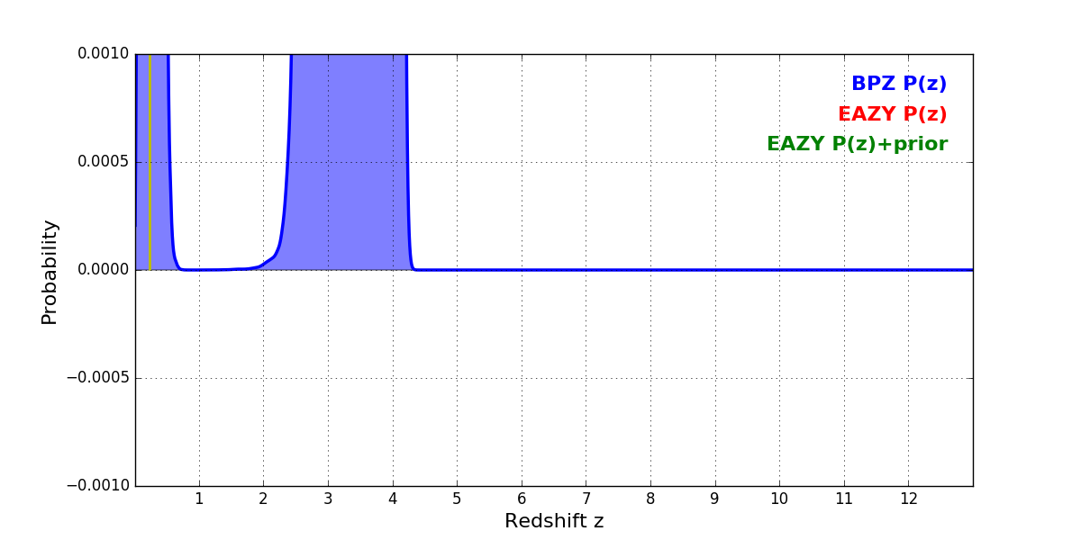 In P(z) plots: Yellow lines mark the cluster redshift z = 0.228,