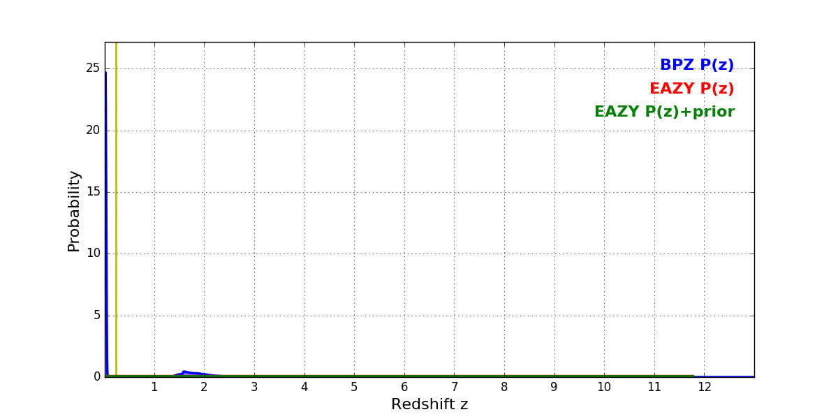 In P(z) plots: Yellow lines mark the cluster redshift z = 0.228,