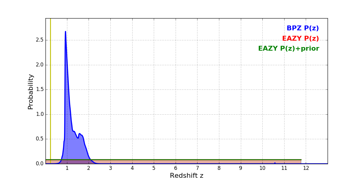 In P(z) plots: Yellow lines mark the cluster redshift z = 0.228,