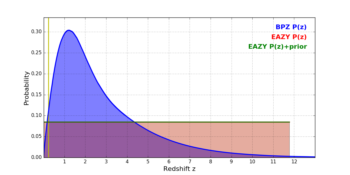 In P(z) plots: Yellow lines mark the cluster redshift z = 0.228,