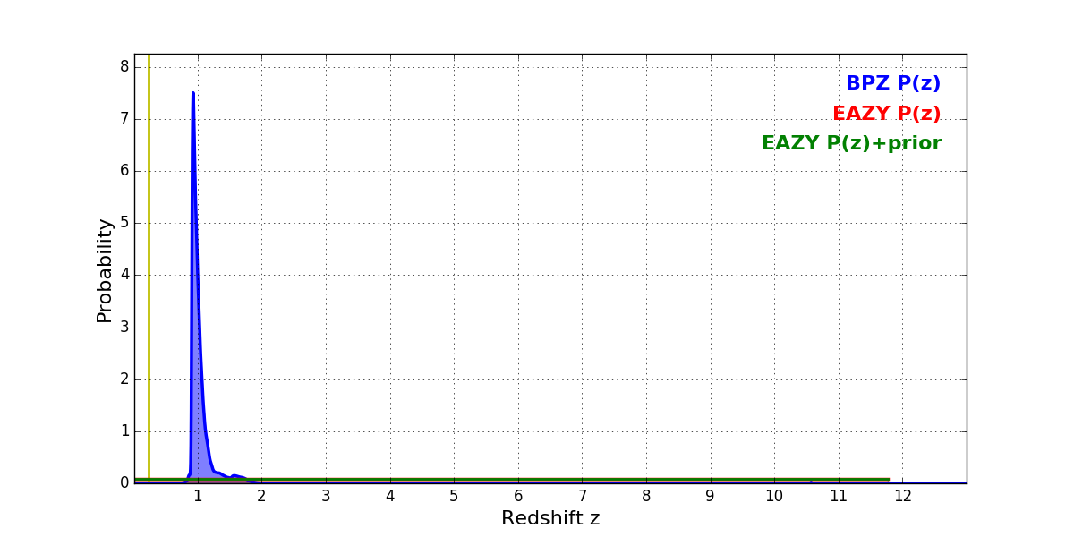 In P(z) plots: Yellow lines mark the cluster redshift z = 0.228,