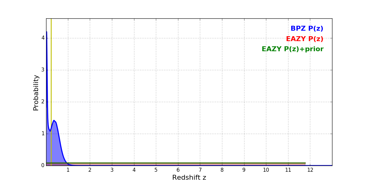 In P(z) plots: Yellow lines mark the cluster redshift z = 0.228,