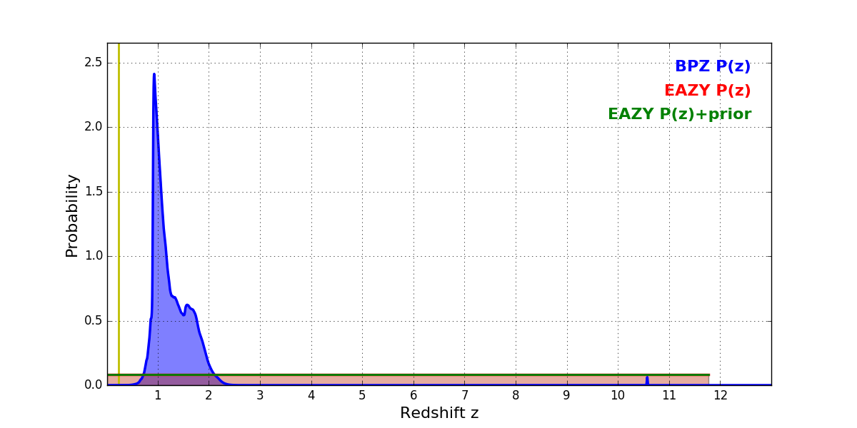 In P(z) plots: Yellow lines mark the cluster redshift z = 0.228,