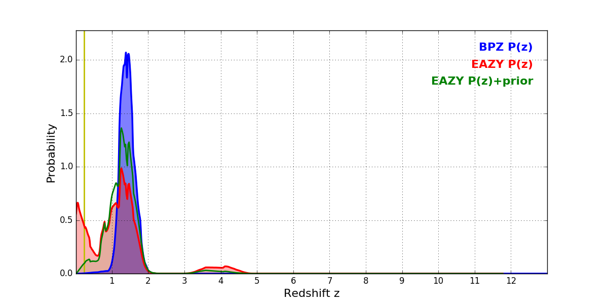 In P(z) plots: Yellow lines mark the cluster redshift z = 0.228,