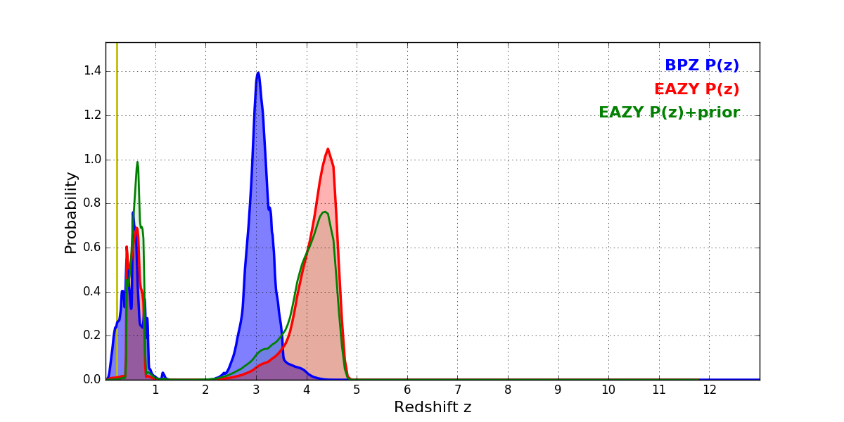 In P(z) plots: Yellow lines mark the cluster redshift z = 0.228,