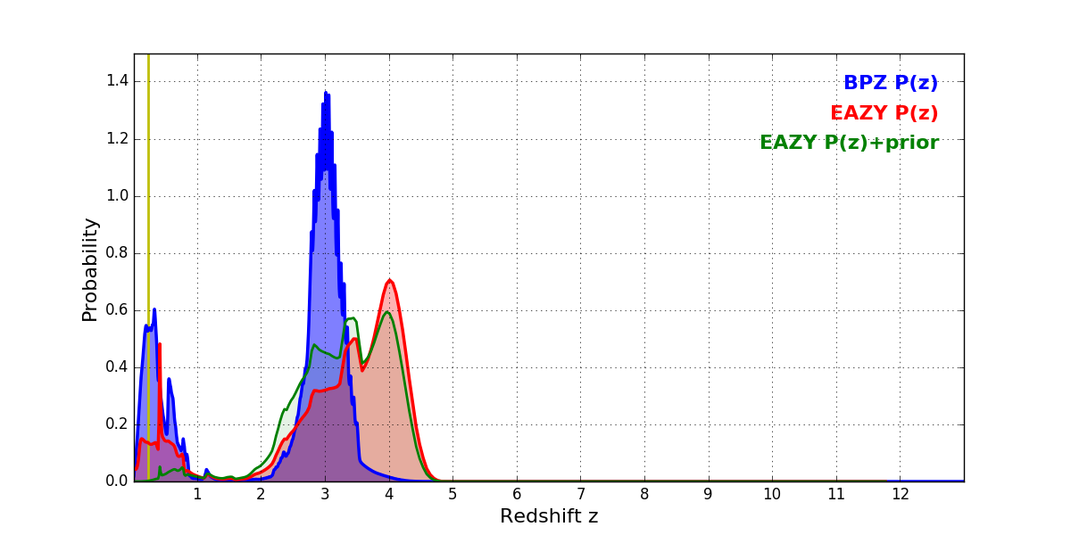 In P(z) plots: Yellow lines mark the cluster redshift z = 0.228,