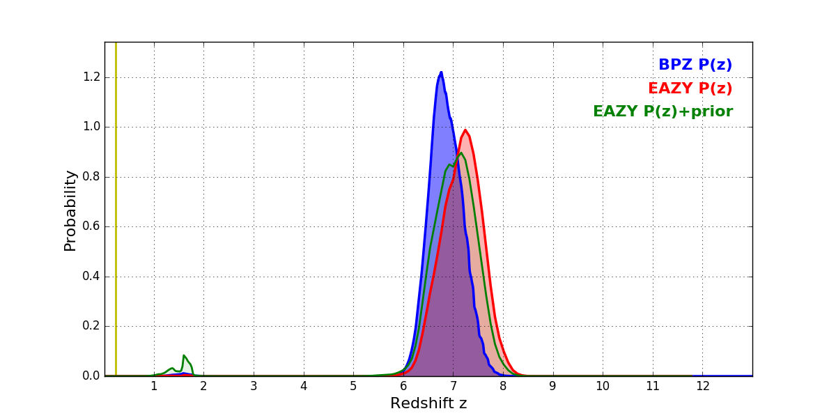 In P(z) plots: Yellow lines mark the cluster redshift z = 0.228,