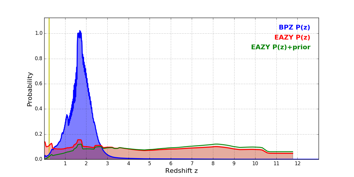 In P(z) plots: Yellow lines mark the cluster redshift z = 0.228,