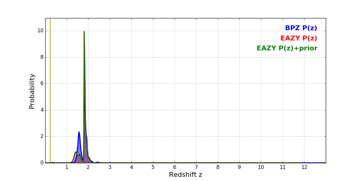 In P(z) plots: Yellow lines mark the cluster redshift z = 0.228,