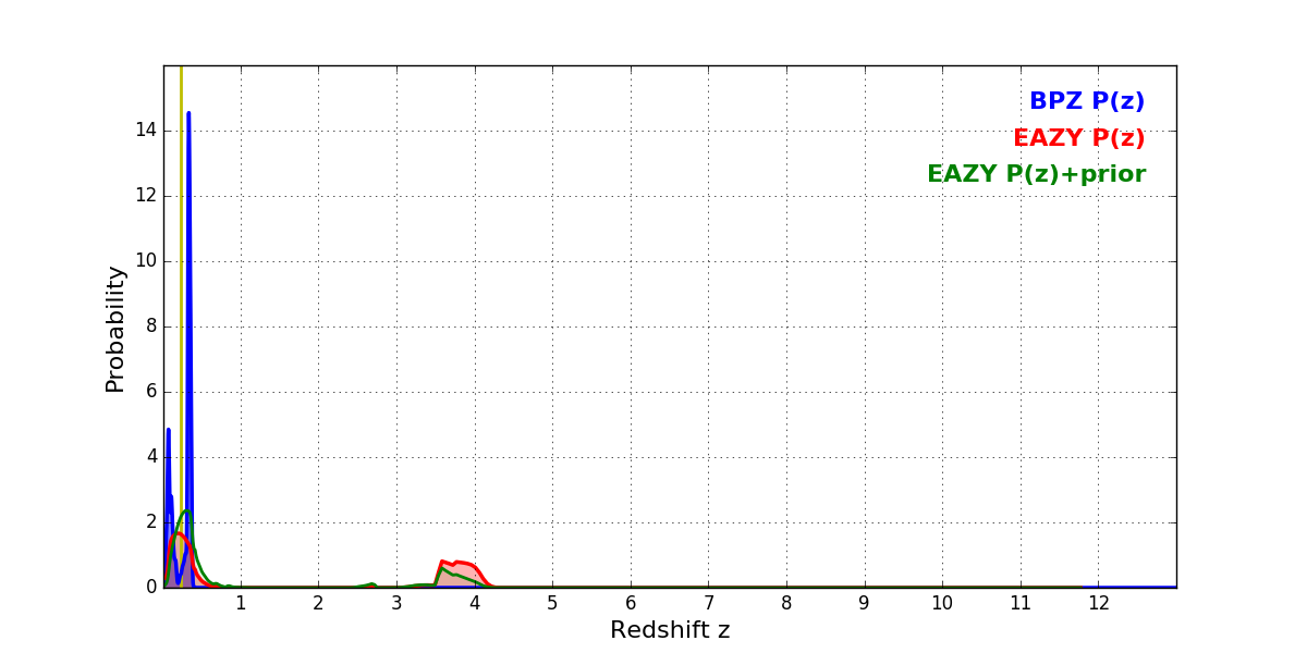 In P(z) plots: Yellow lines mark the cluster redshift z = 0.228,