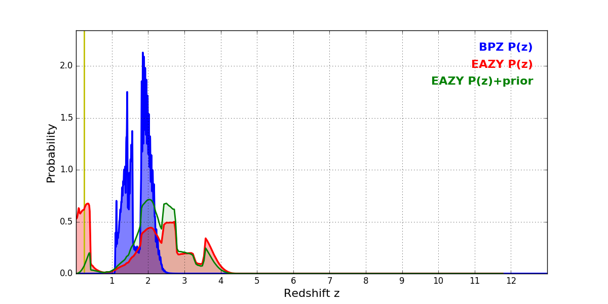In P(z) plots: Yellow lines mark the cluster redshift z = 0.228,