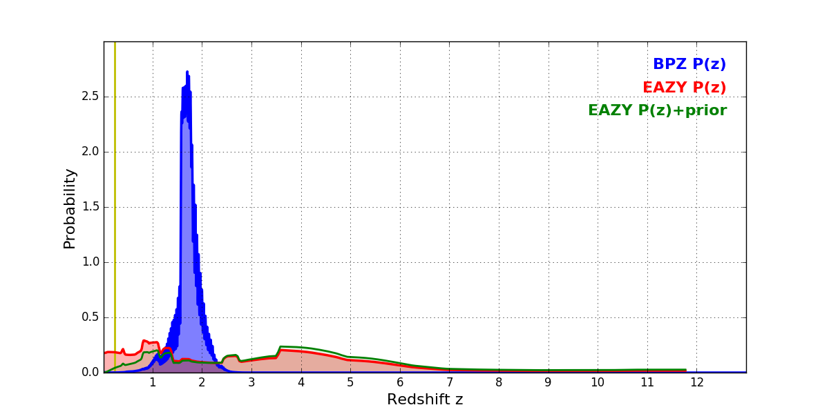 In P(z) plots: Yellow lines mark the cluster redshift z = 0.228,