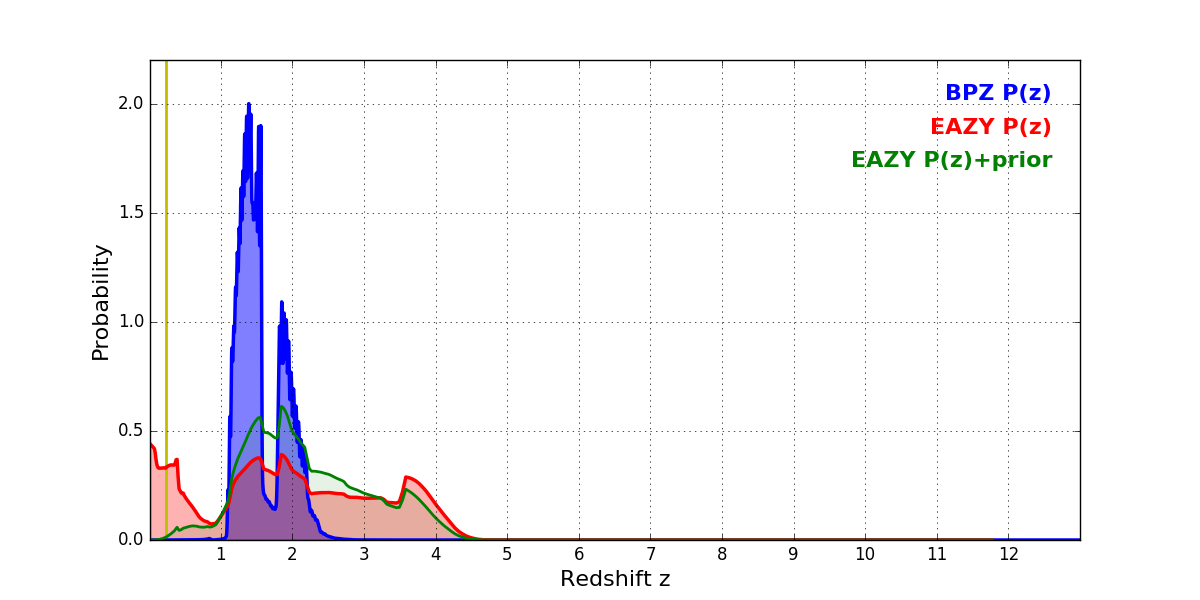 In P(z) plots: Yellow lines mark the cluster redshift z = 0.228,