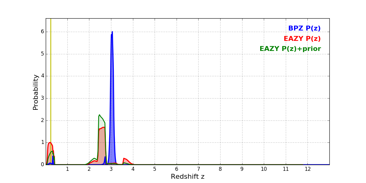 In P(z) plots: Yellow lines mark the cluster redshift z = 0.228,