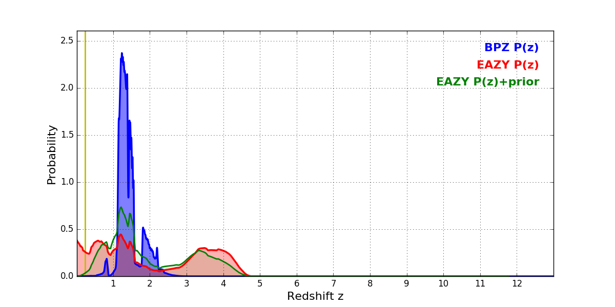 In P(z) plots: Yellow lines mark the cluster redshift z = 0.228,