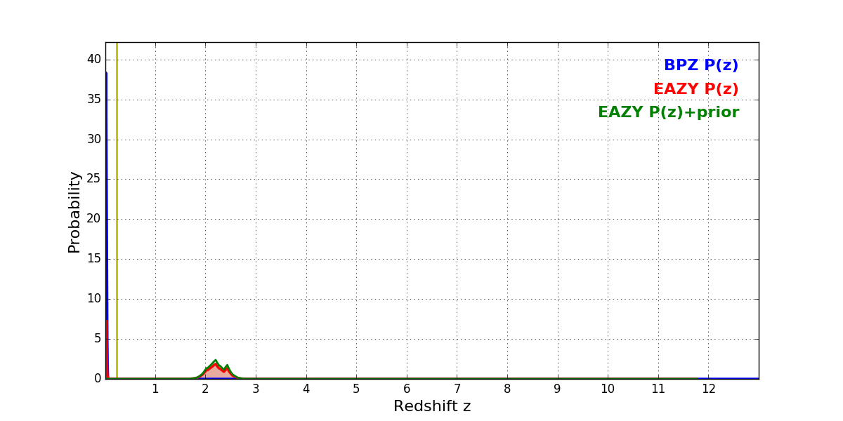 In P(z) plots: Yellow lines mark the cluster redshift z = 0.228,