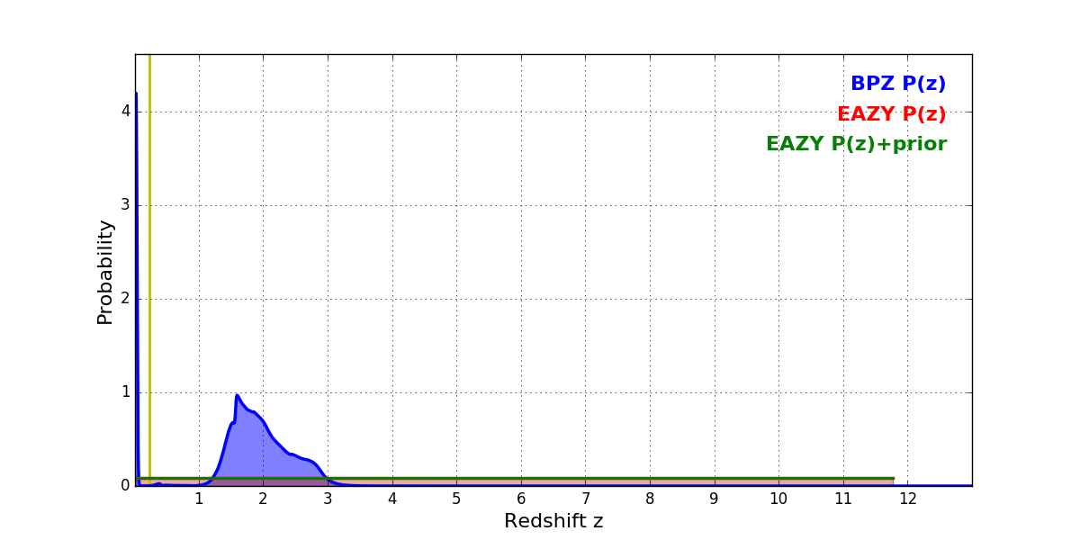 In P(z) plots: Yellow lines mark the cluster redshift z = 0.228,