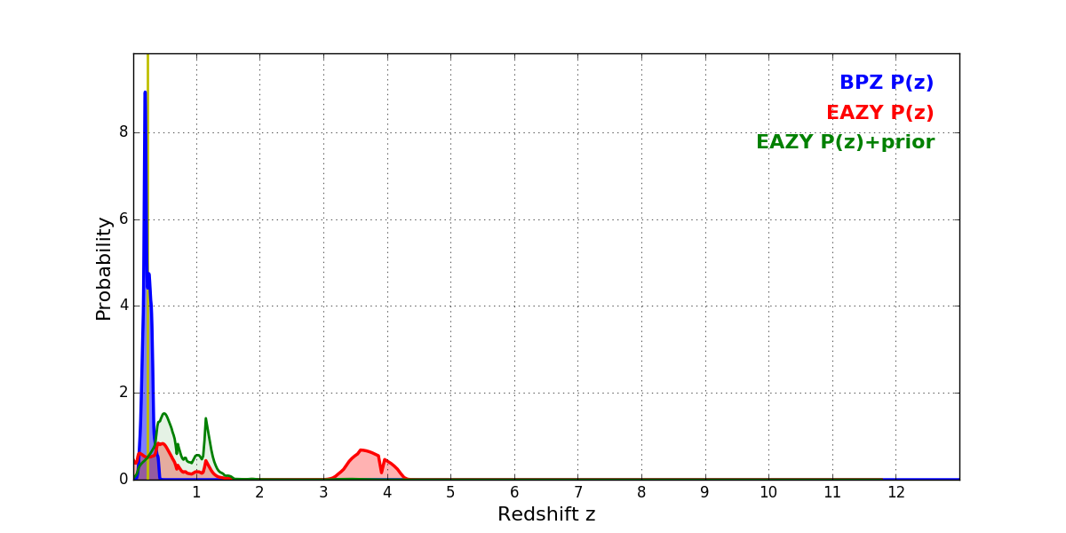 In P(z) plots: Yellow lines mark the cluster redshift z = 0.228,