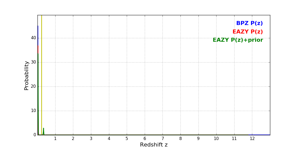 In P(z) plots: Yellow lines mark the cluster redshift z = 0.228,