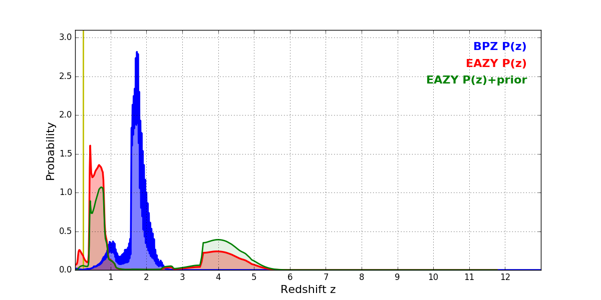In P(z) plots: Yellow lines mark the cluster redshift z = 0.228,