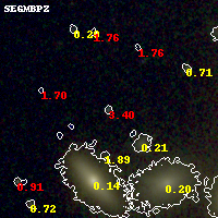 Black segments are analyzed here. Roll mouse over color images to view segments. Best viewed in a wide browser window (1200 pixels or more). Download SED & P(z) plots to view larger versions.
