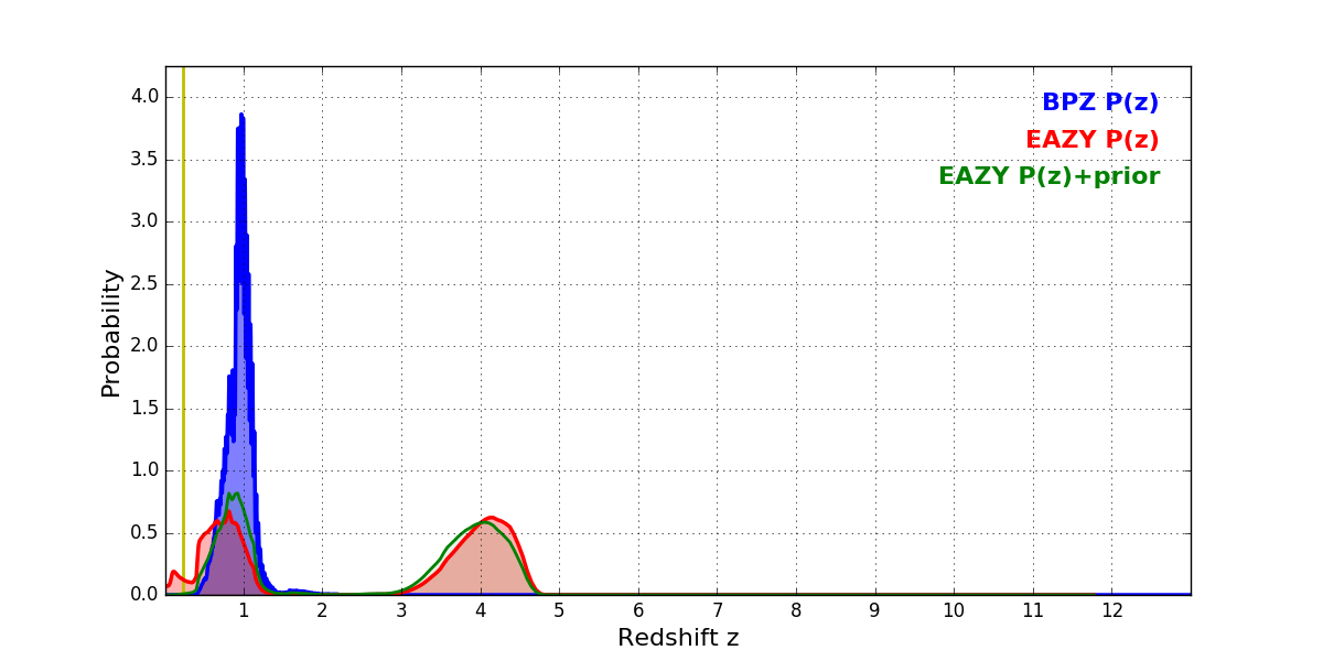 In P(z) plots: Yellow lines mark the cluster redshift z = 0.228,