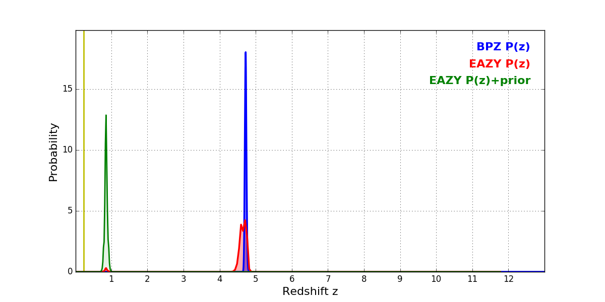 In P(z) plots: Yellow lines mark the cluster redshift z = 0.228,