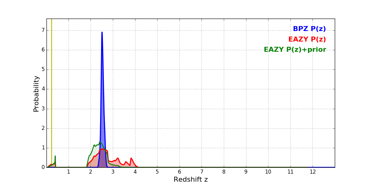 In P(z) plots: Yellow lines mark the cluster redshift z = 0.228,