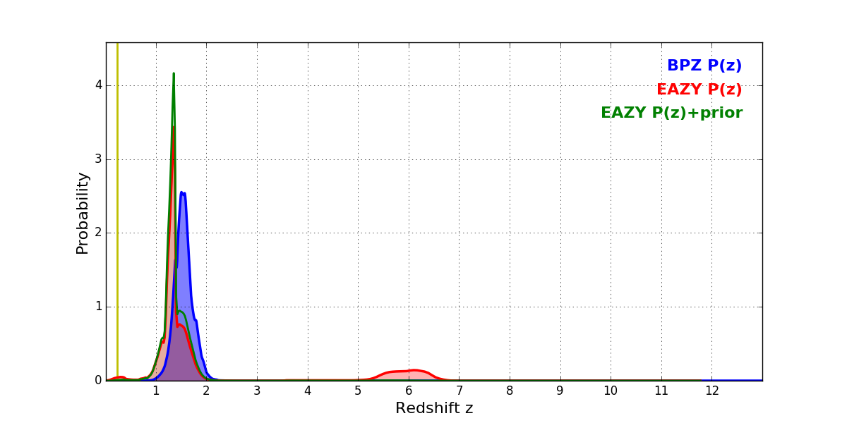 In P(z) plots: Yellow lines mark the cluster redshift z = 0.228,