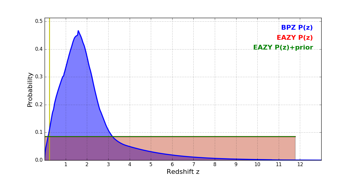 In P(z) plots: Yellow lines mark the cluster redshift z = 0.228,