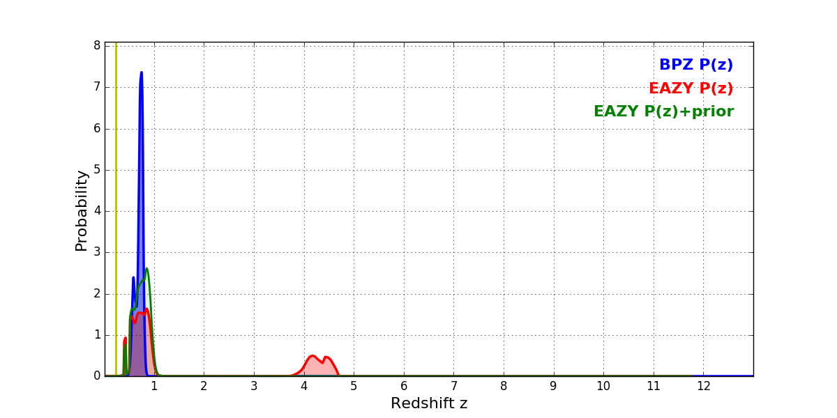 In P(z) plots: Yellow lines mark the cluster redshift z = 0.228,