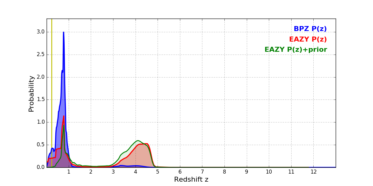 In P(z) plots: Yellow lines mark the cluster redshift z = 0.228,