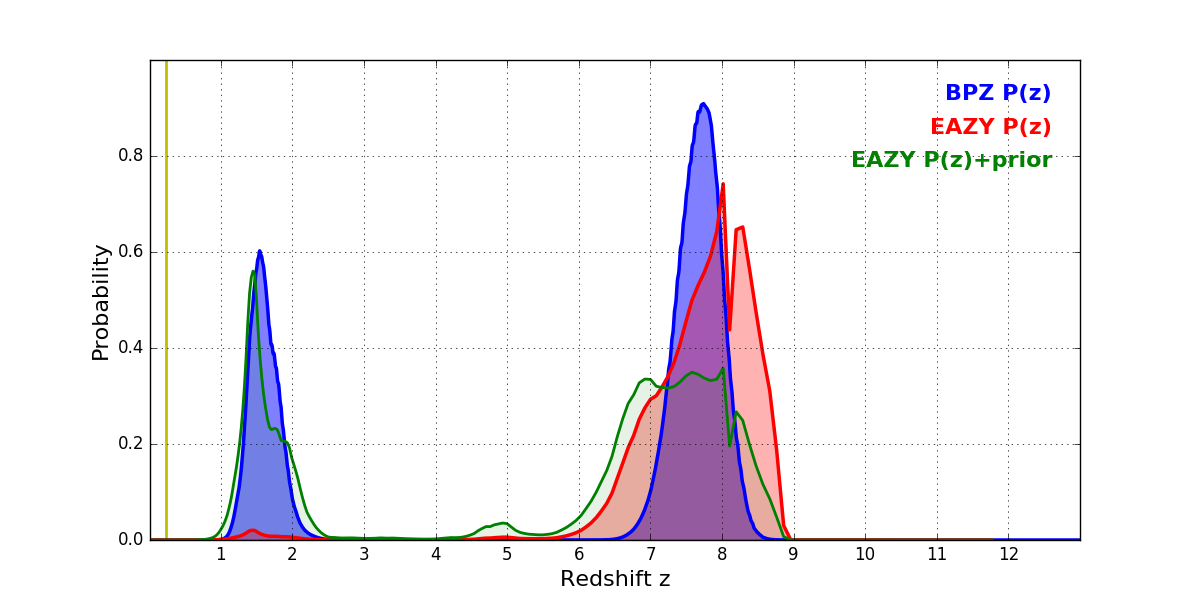 In P(z) plots: Yellow lines mark the cluster redshift z = 0.228,