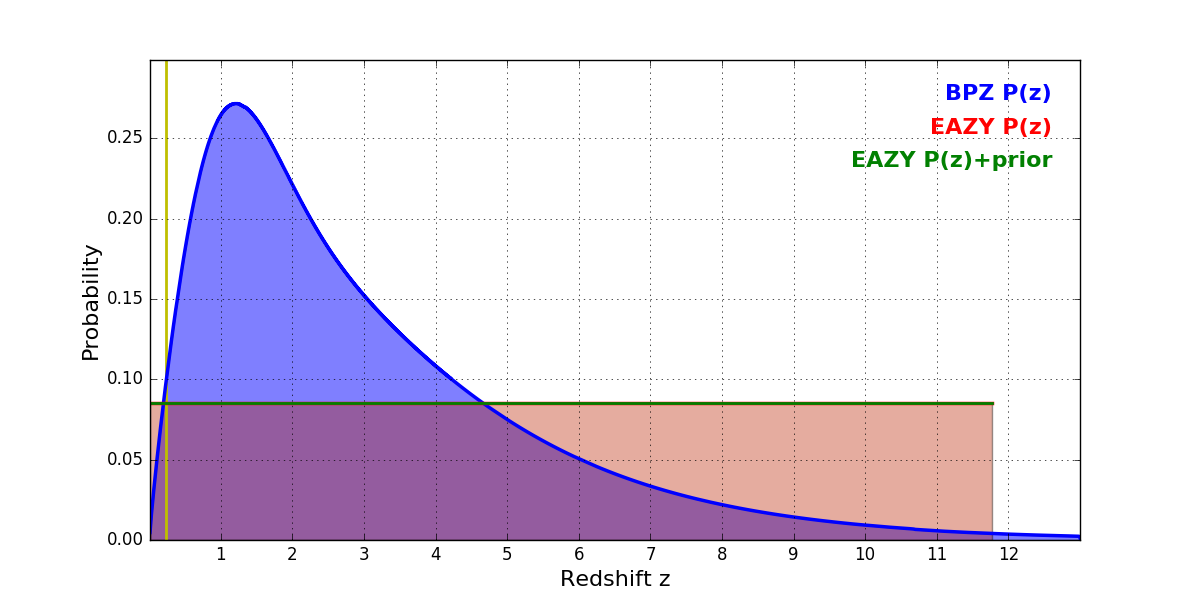 In P(z) plots: Yellow lines mark the cluster redshift z = 0.228,